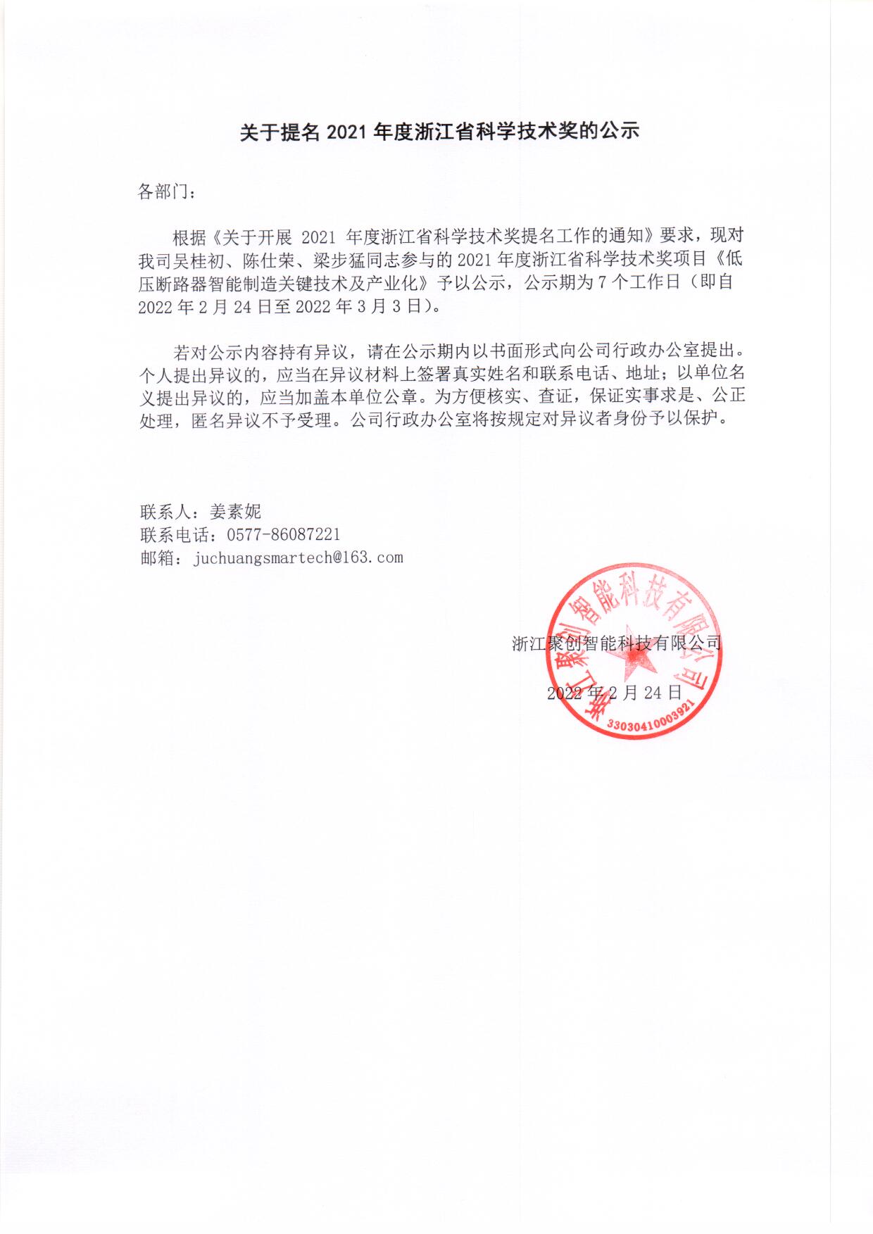 根據(jù)《關于開展 2021 年度浙江省科學技術獎提名工作的通知》要求,現(xiàn)對我司吳桂初、陳仕榮、梁步猛同志參與的2021年度浙江省科學技術獎項目《低壓斷路器智能制造關鍵技術及產(chǎn)業(yè)化》予以公示,公示期為7個工作日(即自2022年2月24日至2022年3月3日)。